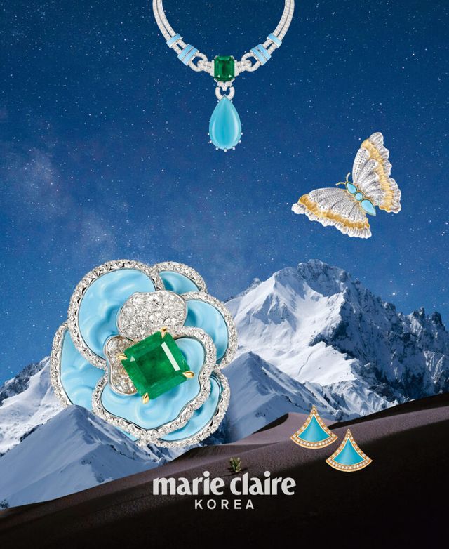 커다란 물방울 모양 튀르쿠아즈와 31.99캐럿의 에메랄드 컷 콜롬비아 에메랄드를 수직으로 나란히 세팅해 화려함을 극대화한 뇌 마린 네크리스 Van Cleef & Arpels.