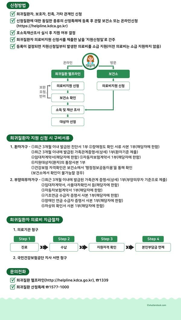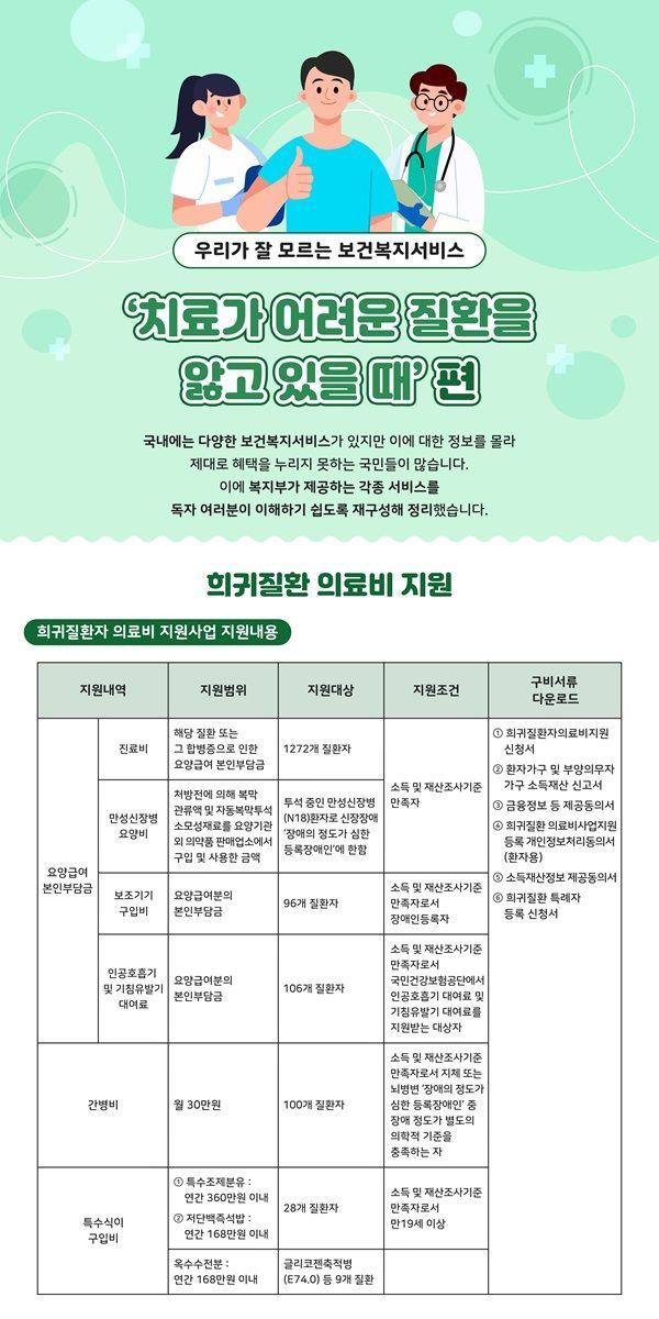 지난 ‘생활이 어려워 의료비 부담하기 힘들 때’에 이어 ‘치료가 어려운 질환을 앓고 있을 때’ 편을 통해 각종 지원제도를 소개합니다. 두 번째 순서는 저소득층 희귀질환자에 대한 의료비지원사업입니다. 희귀질환 산정특례에 등록한 건강보험가입자가 그 대상으로 환자가구와 부양의무자가구의 소득 및 재산기준이 모두 만족하는 경우 지원 가능합니다. 희귀질환자 의료비지원사업 대상질환은 총 1272개로 지원항목은 ▲요양급여비 ▲보조기기구입비 ▲인공호흡기 및 기침유발기 대여료 ▲간병비 ▲특수조제분유 및 저단백 즉석밥 구입비 ▲옥수수전분 구입비 등입니다.
