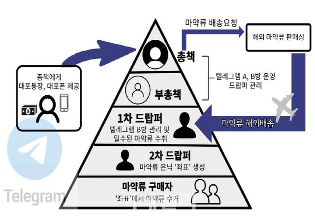 검찰에 따르면 이들은 철저한 점조직 형태로 운영됐다. 총책 A씨(43)와 부총책 B씨(32)는 텔레그램 채널을 개설해 드랍퍼를 모집·관리했다. 1차 드랍퍼 C씨(30)는 텔레그램 하위 채널을 개설해 ‘좌표’(주소 정보)를 전송하며 마약류 판매에 직접 참여했고, 2차 드랍퍼 D씨(29)는 총책의 지시에 따라 마약류를 은닉하고 ‘좌표’를 전달했다.