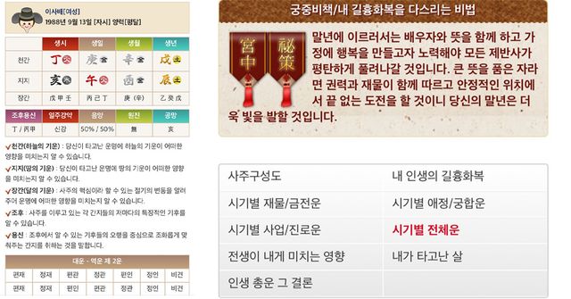 한편, 온라인 사주 전문 사이트 ‘위키사주’는 오랜 전통의 사주팔자 분석과 현대적인 기술을 결합해 각자의 운명을 상세히 분석하는 서비스를 제공하고 있다. 사용자는 이름, 생년월일, 태어난 시간, 성별을 입력해 간단히 이용할 수 있다. 더불어 신년을 맞아 다양한 사주 서비스가 출시됐다. 소름쫙 신년운세 2025, 딱 맞춤 신년운세 2025, 소름쫙 토정비결 2025, 냉정하고 솔직한 쪽집게 감정, 후련한 토정비결, 출사표 비책, 타로 예지, 핵심 분석 등을 통해 내년 한 해 나의 운세를 미리 점칠 수 있다.