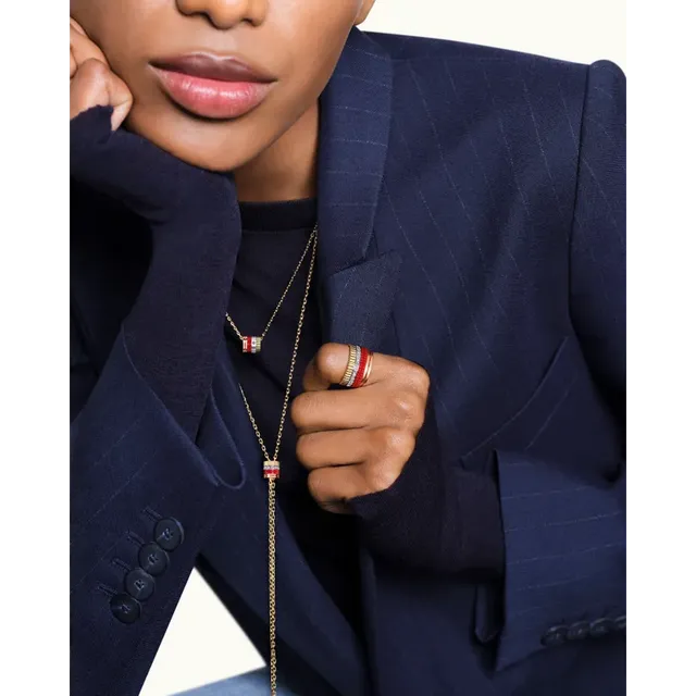 부쉐론의 콰트로 링은 이름처럼 네 개의 반지가 하나로 결합된듯한 디자인입니다. 그중에서도 레드 에디션 제품을 추천하고 싶은데요. 옐로 골드, 다이아몬드가 세팅된 화이트 골드, 핑크 골드 세 가지 요소에 레드 세라믹을 더해 다채로운 무드를 불러 일으킵니다. 묘하게 어우러지는 네 가지 보석의 조합 덕분에 모든 룩에 잘 어울리죠.