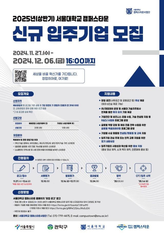 서울대학교와 관악구청은 ‘2025년 상반기 서울대학교 캠퍼스타운 신규 입주기업 모집’을 시작한다고 밝혔다. 이번 모집은 창의적이고 혁신적인 아이템을 보유한 (예비)창업자와 창업 7년 이내, 대표자 연령 39세 이하인 청년창업기업(단, 교원창업의 경우 연령제한 없음)을 대상으로 진행한다.