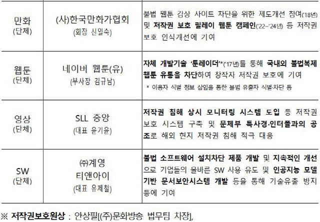 문체부는 저작권 보호에 대한 국민 인식을 높이고 민간 참여 확대를 위해 올해 대한민국 저작권 보호 대상을 신설했다. 지난 8∼9월 대국민 공모를 통해 후보자 추천을 받은 뒤 음악·영상·출판·소프트웨어·웹툰·만화 등 K-콘텐츠 저작권 보호에 힘쓴 개인 3명과 단체 5곳을 선정했다.
