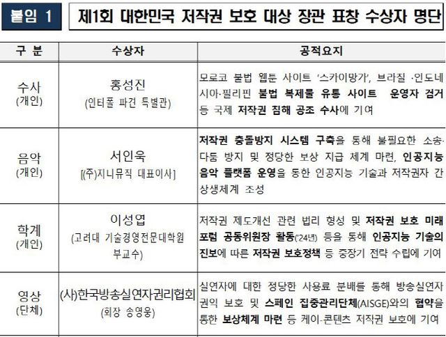 그 결과 서인욱 대표를 비롯해 △국제 공조 수사에 큰 성과를 거둔 홍성진 인터폴 특별관(경찰청) △인공지능(AI) 기술 진보에 따른 저작권 보호정책 수립에 기여한 이성엽 고려대 기술경영전문대학원 부교수가 대상을 받았다. 단체로는 △한국방송실연자권리협회와 △한국만화가협회 △네이버웹툰 △SLL중앙 △㈜계영 티앤아이 등 5곳이 이름을 올렸다.
