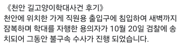 아울러 대전지검 천안지원은 이달 5일 천안서북경찰서에 보완 수사를 지시했다. 검거 직후 가해자는 경찰에 “집 근처에서 (고양이들이) 쓰레기봉투를 자꾸 뜯어서 지저분하고 보기가 좋지 않아 잡아서 다른 곳에 옮길 목적으로 그랬다”라는 취지로 진술한 것으로 알려졌다.