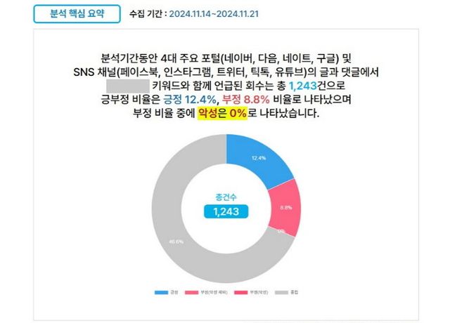 해당 기업(기관)과 인물(기업인, 정치인, 예술인 등)에 대한 포탈, 뉴스, 커뮤니티, SNS 등의 데이터를 실시간 수집해 통계 분석을 진행한다. 현재의 여론과 트렌드를 신속하고 정확하게 파악하여 그에 따른 대응을 빠르게 실행할 수 있는 것이 기존 여론 조사와 큰 차별점이다.