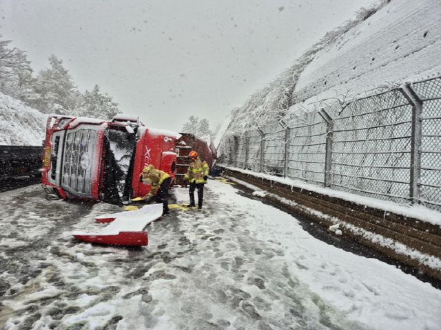 경찰은 트레일러가 눈길에 미끄러져 사고로 이어진 것으로 보고 정확한 경위를 조사하고 있다.
