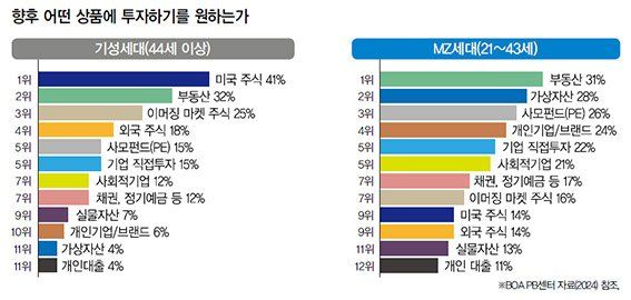 기성세대는 투자 1순위 상품으로 미국 주식을, 2순위로 부동산을 선정한 반면, MZ세대는 1순위로 부동산을, 2순위로 가상자산을 각각 뽑았다.