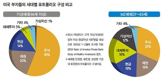 올해 초 아메리카은행(BOA) PB센터가 미국의 고액 자산가(300만달러 이상의 현금자산 보유자)들을 대상으로 투자 포트폴리오를 조사한 결과를 보면 MZ세대 투자법은 기성세대와 큰 차이를 보인다. 기성세대(44세 이상의 자산가)의 포트폴리오를 들여다보면, 주식과 채권 비중은 76%(주식 56%+채권 20%)였다. 반면 MZ세대의 포트폴리오 가운데 주식과 채권 비중은 51%(주식 32%+채권 19%)에 그쳤다. 기성세대와 MZ세대가 주식과 채권을 바라보는 시각이 다름을 엿볼 수 있다.