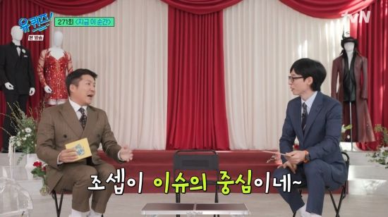 27일 방송된 tvN '유 퀴즈 온 더 블럭'(이하 '유퀴즈')에서는 '지금 이 순간' 특집으로 꾸며진 가운데 유재석이 송승헌과 조세호가 출연자 화제성 조사에서 각각 1위와 2위를 차지했다는 소식을 밝힌 장면이 전파를 탔다.