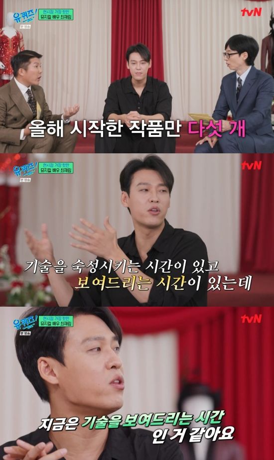 또 유재석은 "재림 씨가 올해 작품만 다섯 작품이라고 한다. 이렇게 쉬지 않고 작품을 하시는 이유가 있냐"라며 질문했고, 최재림은 "그런 시기가 온 거 같다. 기술을 배우기 위한 배움의 시간이 있고 이 배움을 숙성시키는 시간이 있고 이제 플레이어로서 이 기술을 보여드려야 되는 시간이 있는데 지금은 보여드리는 시간에 많이 가까워져서 한참 달리고 있는 거 같다. 많이 찾아주는 시간이 지나갈 건데. 지나가기 마련이지 않냐. 기회가 있고 시간이 있고 할 수 있는 체력과 의지가 있으면 계속 새롭게 보여드리자'라는 마음을 크게 갖고 있어서 올해 특별히 작품을 많이 참여하는 거 같다"라며 진심을 드러냈다.