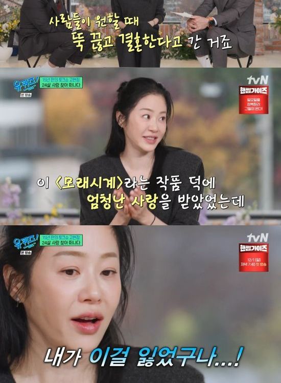 고현정은 "내가 지금 이 '모래시계'라는 작품 덕에 모두의 관심을 받고 엄청난 사랑을 받았었는데 그때 당시에 모르고 지난 거다. '내가 이걸 잃었구나. 조금 더 내 삶에 집중했으면 후회가 없었을 텐데' 그 상실이 몇 년 뒤에 저한테 훅 와서 그때 엄청 펑 뚫린 것 같았다. 저도 모르게 확 눈물이 나서 울었었다, 많이. 오랜 시간"이라며 고충을 토로했다.