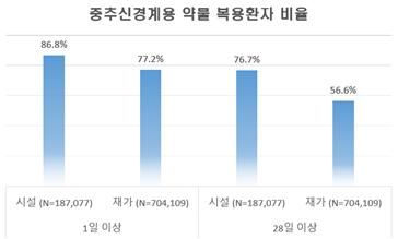시설수급자와 재가수급자 중 중추신경계용 약물 1일 이상 복용환자 비율은 각각 86.8%, 77.2%로 시설수급자에서 사용 비중이 9.6%p 더 높았다.
