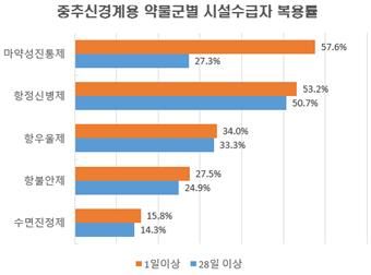 연간 28일 이상 복용 건을 대상으로 했을 때는 항정신병제(50.7%), 항우울제(33.3%) 순으로 높았다.