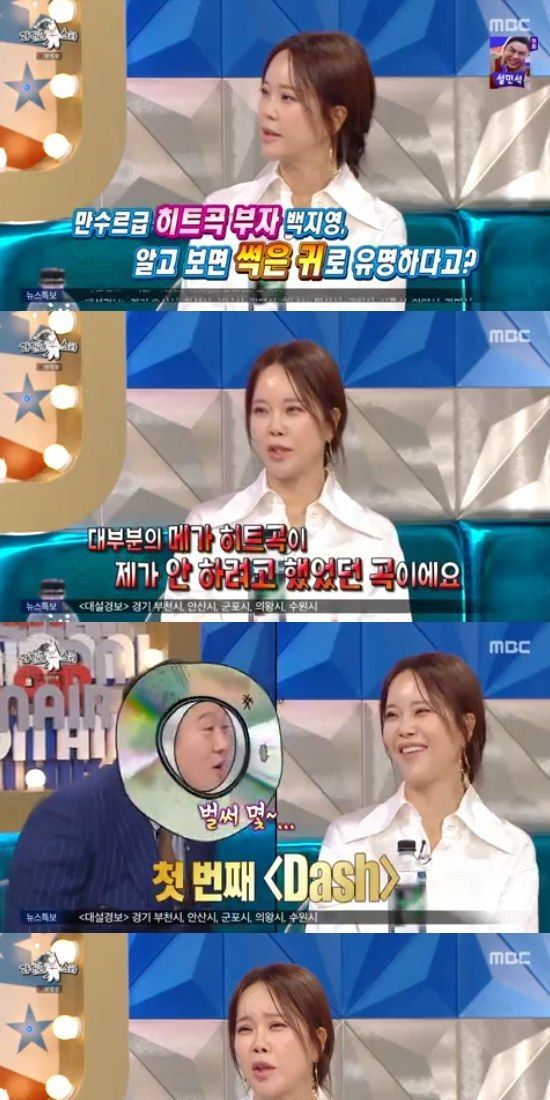 이날 '히트곡 부자'인 백지영은 스스로 '썩은귀'임을 인정하면서 "메가 히트곡들이 대부분 제가 안 하려고 했던 노래다. 일단 '대시'가 그렇다"고 말문을 열었다.