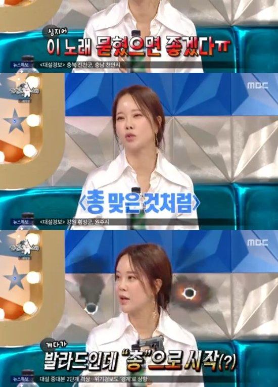 또 백지영은 과거 북한 공연에서 '총 맞은 것처럼'을 불렀던 당시를 회상하면서 "노래 선곡은 북측에서 해주신거다. 왜 하필 이 노래를 부르라고 했을까 무서웠다"고 말했다.