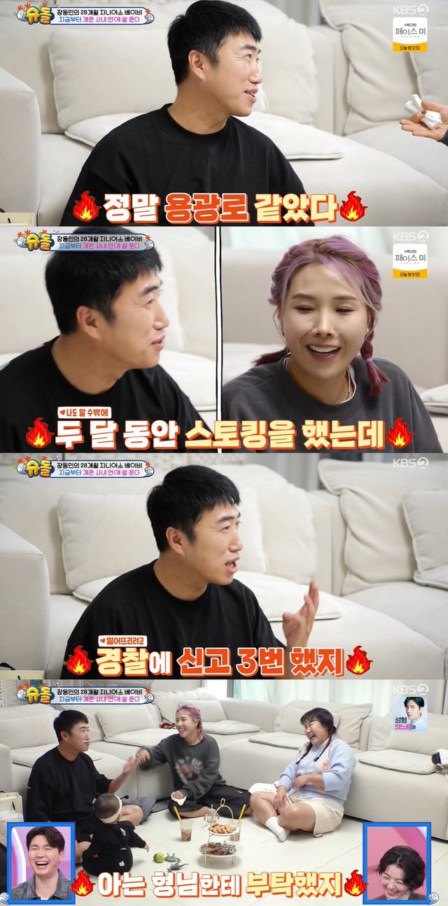 이날 신봉선은 "동민 선배를 거의 20년 가까이 보고 있지만 다른 모습을 대충 다 본 것 같은데 아빠 장동민을 내가 본 적이 없다"며 아빠 장동민의 모습을 만나기 위해 방문했다고 밝혔다.