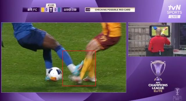 당초 말렐레에게 옐로카드를 꺼냈던 주심은 이후 VAR 심판실과 교신을 거쳐 직접 온 필드 리뷰에 나섰다. 중계화면 등을 통해 나온 장면은 더욱 위험한 파울이었음이 명확했다. 한참을 해당 장면을 돌려보던 주심은 그러나 원심 그대로 옐로카드를 주는 데 그쳤다. 광주 입장에선 황당할 수밖에 없는 상황이었다.
