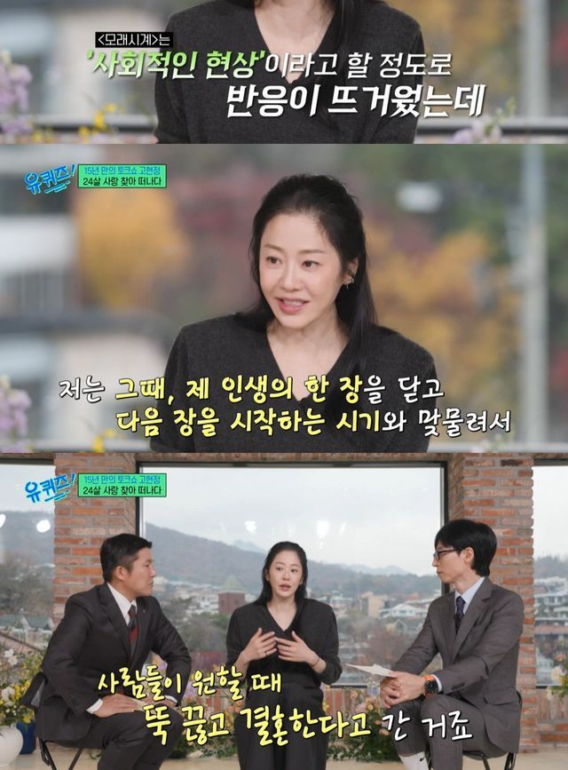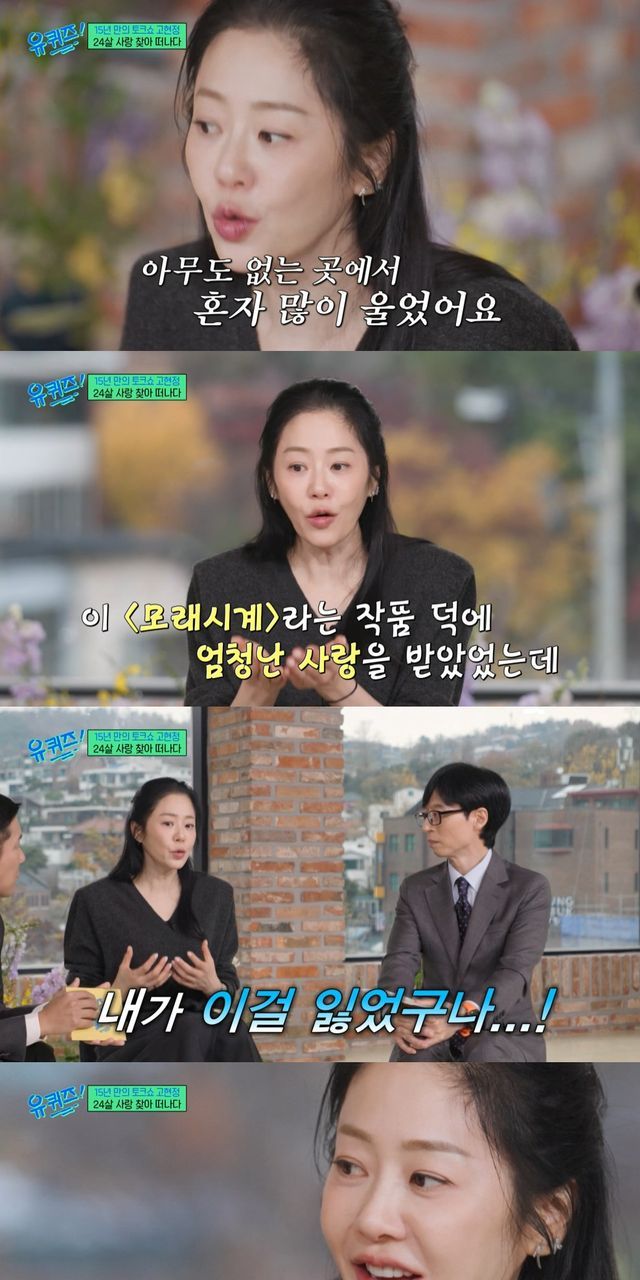 이어 고현정은 "집중적으로 일하다가 영광스러운 '모래시계'까지 하고 사람들이 원할 때 뚝 끊고 결혼한다고 한 거다"라며 "대중이 소비하고 싶을 때 그러지 못한 상실감을 잘 모르고 살았다. 그러다가 결혼하고 몇년 뒤 미국 교포분들이 테이프로 '모래시계' 보고 제게 피드백을 주신 적이 있다. 아무도 없는 곳에서 혼자 많이 울었다"고 고백했다.