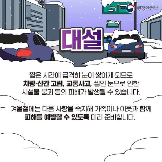 이밖에 긴급재난문자, TV자막방송 등 다양한 매체를 활용해 강설·결빙에 따른 피해 예방을 위한 재난안전정보를 적극 안내한다.