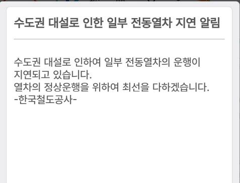 연이은 폭설로 이날 오전 전철 운행에도 차질이 빚어지고 있다. 오전 8시 기준 서울지하철 1호선과 수인분당선 열차 운행이 지연되고 있다. 한국철도공사(코레일) 측은 “선로에 눈이 쌓여 이를 치우느라 열차 출고가 늦어지고 있다”고 밝혔다.