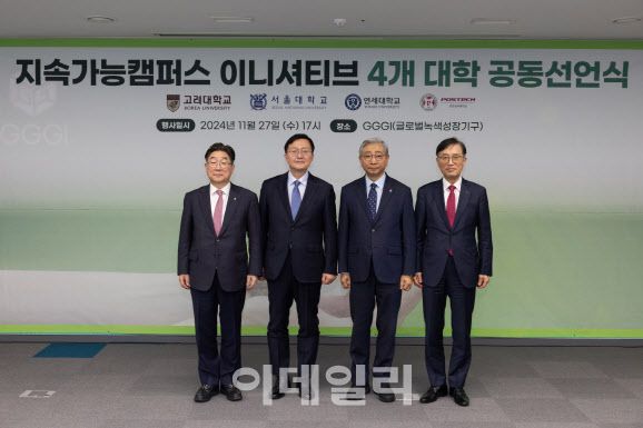 고려대·서울대·연세대·포스텍은 지난 27일 서울 정동 글로벌녹색성장기구(GGGI) 회의실에서 4개 대학 공동 선언식을 개최했다. 이 자리에는 김동원 고려대 총장, 유홍림 서울대 총장, 윤동섭 연세대 총장, 김성근 포스텍 총장이 참석했다.