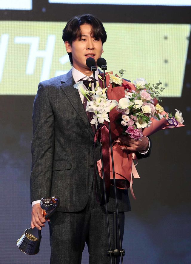 26일 오후 서울 송파구 잠실 롯데월드 호텔에서 열린 프로야구 '2024 신한 SOL 뱅크 KBO리그' 시상식에서 수비상 유격수 부문을 수상한 KIA 박찬호가 수상소감을 밝히고 있다. / 뉴스1