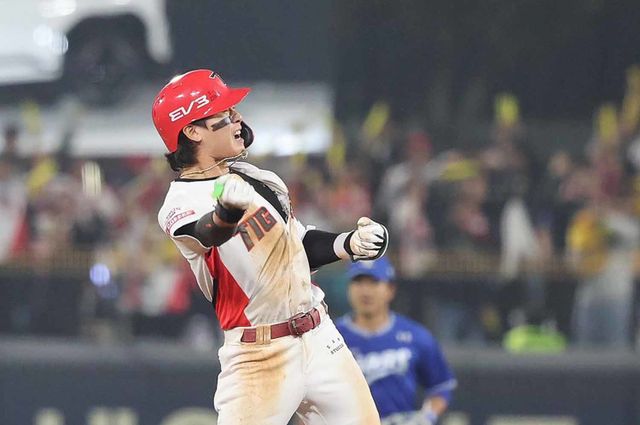 10월 28일 오후 광주 기아챔피언스필드에서 열린 프로야구 '2024 신한 SOL 뱅크 KBO 포스트시즌' 한국시리즈 5차전 삼성 라이온즈와 KIA 타이거즈의 8회말 KIA 공격 1사 1루 상황에서 박찬호가 1타점 2루타를 친 뒤 환호하고 있다. / 뉴스1