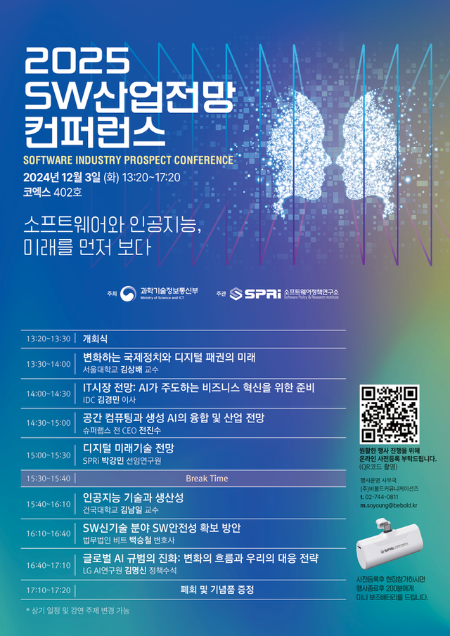 과학기술정보통신부가 주최하고 SPRi가 주관하는 ‘2025 SW산업전망 컨퍼런스’는 ‘소프트웨어와 인공지능, 미래를 먼저 보다’를 주제로 국내 및 글로벌 SW산업과 SW시장을 전망해 국내 산·학·연·관 소속 기관들의 전략 및 정책 수립을 지원하는 자리가 될 전망이다.
