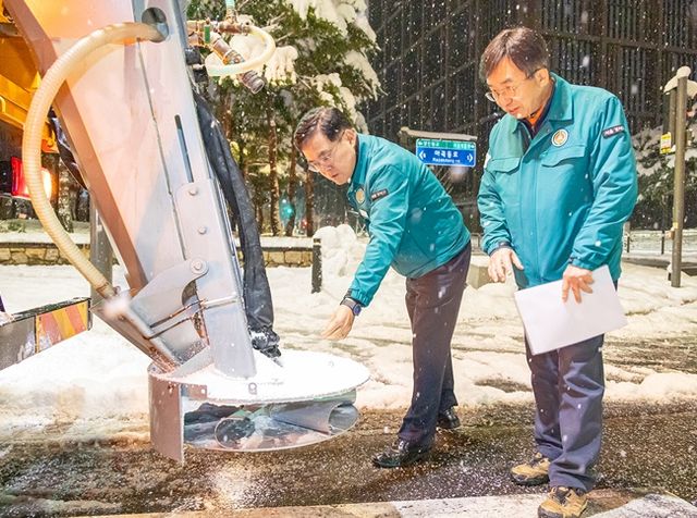 | ▲ 대설경보가 발효된 가운데 진교훈 서울 강서구청장(왼쪽)이 새벽부터 마곡지구 일대 도로의 제설상황을 점검했다. |