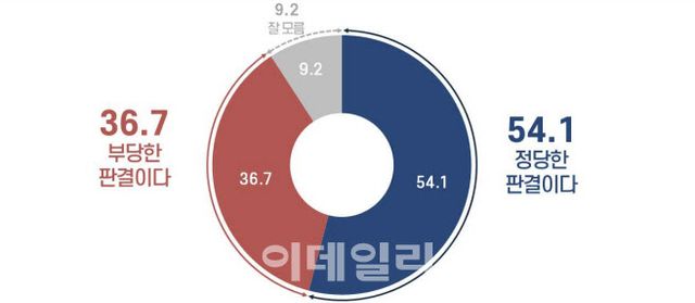 반면에 70세 이상(정당 판결 35.1%, 부당 판결 50.8%)에서는 ‘부당한 판결’이라는 응답이 우세했다. 60대에선 정당 판결 48.0%, 부당 판결 47.6%로 찬반 의견이 팽팽한 것으로 조사됐다.
