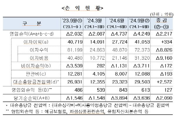 28일 저축은행중앙회에 따르면 3분기 순이익으로 258억을 기록했다. 대손충당금 적립 규모가 감소한 영향이란 분석이다. 저축은행업권은 지난해 4분기 1조2000억원, 올해 1분기 1조2000억원, 2분기 1조1000억원의 대손충당금을 적립했다. 3분기에는 대손충당금 적립 규모가 6000억원으로 감소했다. 이에 따라 흑자로 전환할 수 있었던 것이다. 이에 따라 누적 손실액은 3894억원에서 3636억원으로 줄었다.