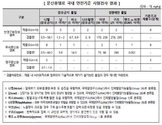 구체적으로 반영구화장용 염료 10개 중 9개 제품에서 함유 금지 물질인 니켈·납·비소·나프탈렌과 함량 제한 기준을 초과한 아연·구리가 검출됐다. 두피문신용 염료 10개 중 8개 제품에선 함유 금지 물질인 니켈·납·비소와 함량 제한 기준을 초과하는 아연·구리·벤조-a-피렌이 검출됐다. 영구문신용 염료 4개 중 3개 제품에선 함유 금지 물질인 니켈이 검출됐다.