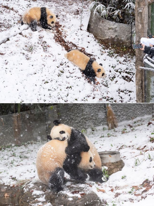 첫눈이 내린 27일, 경기도 용인시 에버랜드에서 쌍둥이 판다 루이바오와 후이바오가 '판생처음' 보는 눈을 즐기고 있다.