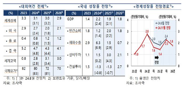 올해 성장률 하향 조정과 관련해 이창용 한국은행 총재는 기자회견에서 “내수는 완만하게 회복되고 있지만, 수출 주력업종에서 주요국과의 경쟁이 심화되는 구조적인 문제가 있다”면서 “도널드 트럼프 미국 대통령 당선 이후 커진 교역환경의 불확실성도 일부 반영해 수출 증가율이 예상보다 상당폭 낮아질 것”이라고 설명했다.