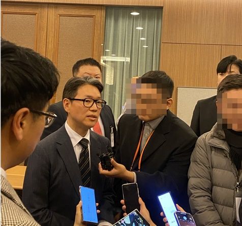 임종훈 한미사이언스 대표가 28일 임시주총이 끝난 직후 취재진에게 발언하고 있다. 사진=유수인 기자