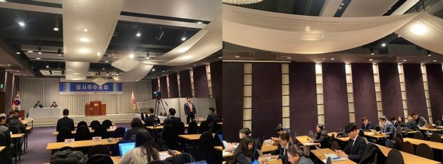 취재진과 주주들을 포함한 현장 참석자 규모는 100여명에 달했다. 주총은 당초 오전 10시에 개회할 예정이었는데, 의결권 위임장 집계 및 검수 과정이 지연되면서 4시간이 지연된 오후 2시 30분 시작됐다. 경영권 분쟁 중인데다 특별결의 요건이 적용되는 안건도 있어 주주 확인에 시간이 걸렸기 때문으로 보인다.