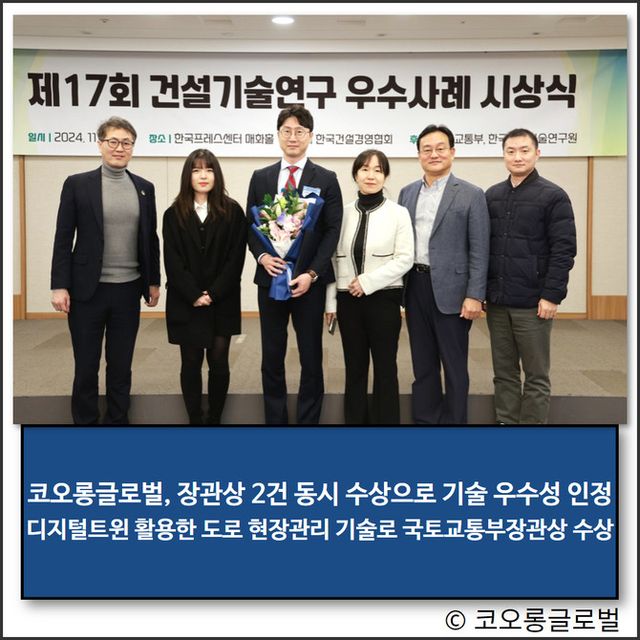 같은 날 코오롱글로벌은 강남구 코엑스에서 열린 '2024 산업기술진흥 유공 및 대한민국 기술대상'에서 '무송풍 세정방식을 적용한 저에너지 국산 분리막 하폐수고도처리 기술'로 산업부장관상도 수상했다.