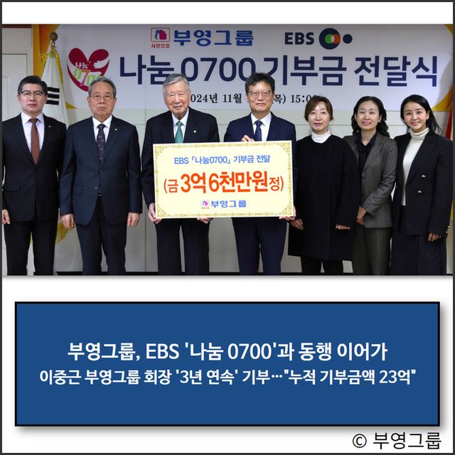 부영그룹이 올해도 우리 사회의 도움이 필요한 이웃을 후원하는 EBS 사회공헌 프로그램 '나눔 0700' 기부에 참여하며 3년 연속 아름다운 동행을 이어간다.