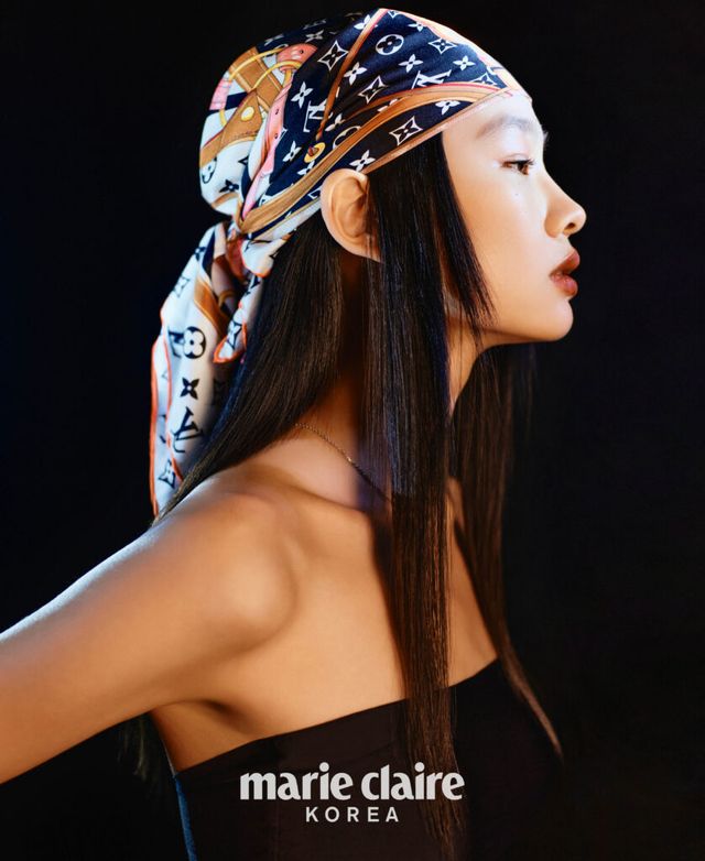 두건으로 연출한 모노그램 스카프, 화이트 골드 이딜 블라썸 펜던트 네크리스, 검지에 낀 더블 사이즈 르 다미에 드 루이비통 링,