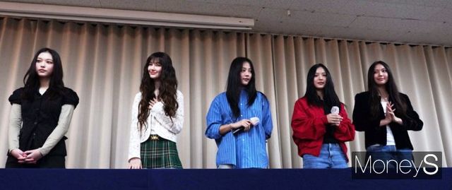 걸그룹 뉴진스(NewJeans 해린, 다니엘, 민지, 하니, 혜인)가 28일 오후 서울 강남구 스페이스쉐어 삼성역센터 갤럭시홀에서 긴급 기자회견을 개최한 가운데 그룹 멤버들의 입장을 전하고 있다.