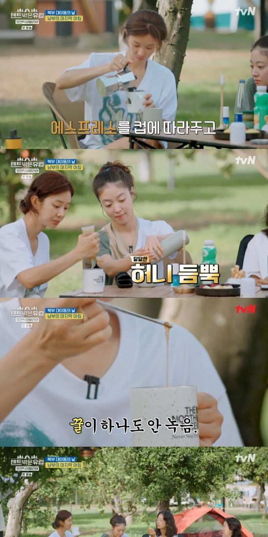 이날 이주빈은 "오늘은 허니 커피를 만들어 먹을 거다"라며 밝혔고, 에스프레소를 컵에 따른 뒤 얼음과 꿀을 넣었다. 그러나 이주빈은 "꿀맛이 안 난다"라며 당황했고, 라미란은 "생각보다 많이 넣어야 된다"라며 조언했다.