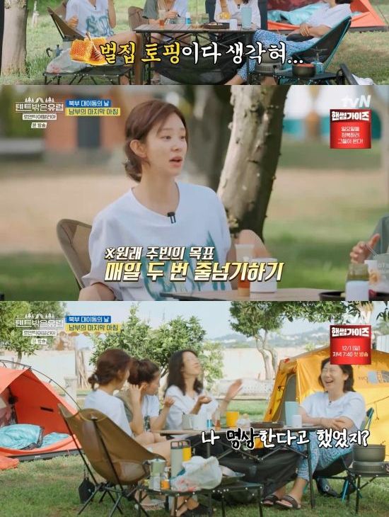 또 라미란은 이주빈이 몸이 찌뿌둥한 듯이 스트레칭을 하자 "어제 너 너무 줄넘기를 많이 해서 그런 거 아니냐"라며 물었다. 이주빈은 "원래 제 목표는 매일 하루에 두 번이었다. 아침 한 번, 저녁 한 번. 근데 개뿔"이라며 너스레를 떨었고, 라미란은 "나 명상한다 그랬었지?"라며 맞장구쳤다.