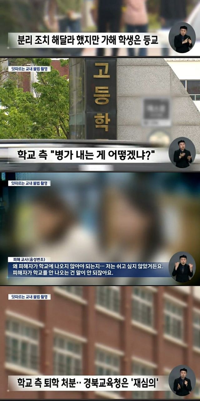 사건 발생 후 학교 측은 분리 조치조차 하지 않고 오히려 피해자인 교사에게 병가를 내라고 종용