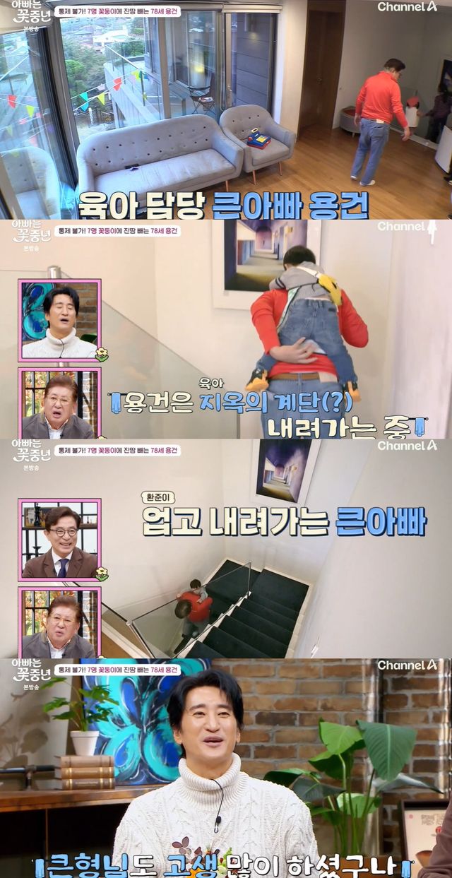 육아 담당을 맡은 김용건은 아이가 계단을 내려가다 다치는 상황을 우려하며 직접 아이를 등에 업고 성치 않은 허리로 계단을 내려가는 모습을 보였다. 이를 지켜보던 신현준은 "우리 대부님도 참 고생 많이 하셨다"고 말했고, 김용건은 "쉽지 않다"고 당시 심정을 밝혔다.