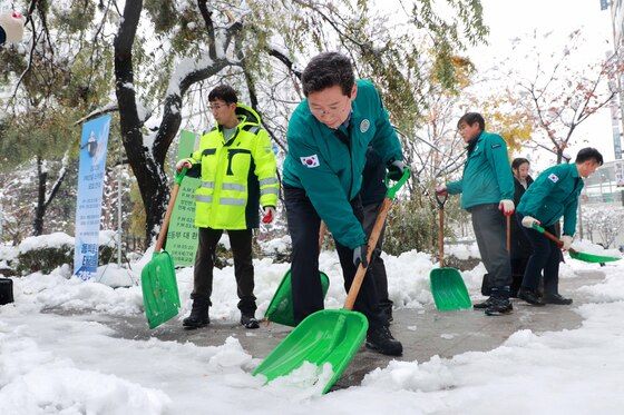 이 시장은 기흥구 동백동 용인경전철 동백역부터 동백2동행정복지센터 주변까지 약1㎞ 구간에서 눈삽을 들고 인도와 횡단보도에 쌓인 눈과 얼음을 제거하는 활동을 시의 직원들과 함께했다.