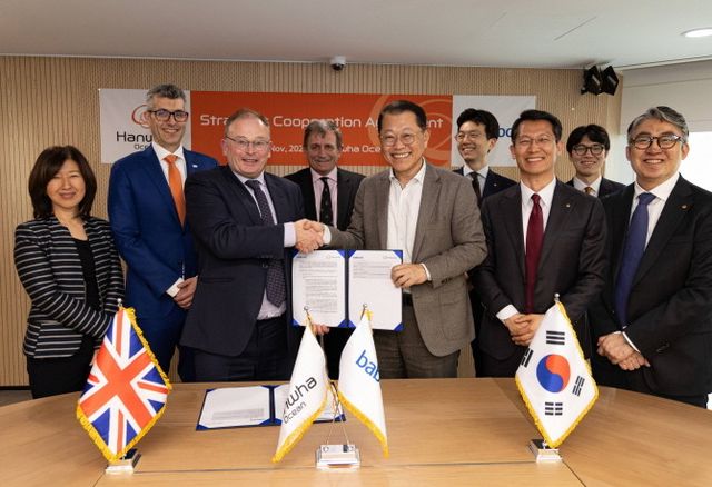 데이비드 락우드(David Lockwood) 밥콕 인터내셔널 그룹 총괄 회장(왼쪽에서 세 번째)과 김희철 한화오션 대표이사 사장(오른쪽에서 세 번째)이 글로벌 함정 수출 시장 진출 확대의 발판을 마련하기 위한 전략적 파트너십 협약을 체결했다. ⓒ 한화오션