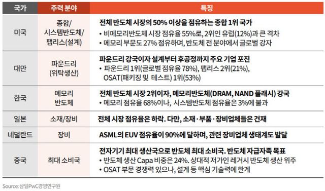 대만은 파운드리 뿐만 아니라 팹리스와 후공정도 함께 육성한 점이 특징이다. 반도체 생산 전 단계에 여러 기업이 포진해 밸류체인이 균형적이고 이익 사이클의 변동성도 낮은 편이다. 한국의 반도체 산업이 대기업 중심의 민간 주도로 발전한 것과 달리 대만은 정부가 전면에 나서서 지원한다. 1973년 설립된 대만공업기술연구원은 세계 최대의 국책기술연구소로, 대만의 대표 반도체 기업인 TSMC와 UMC가 모두 이곳에서 분사됐다.