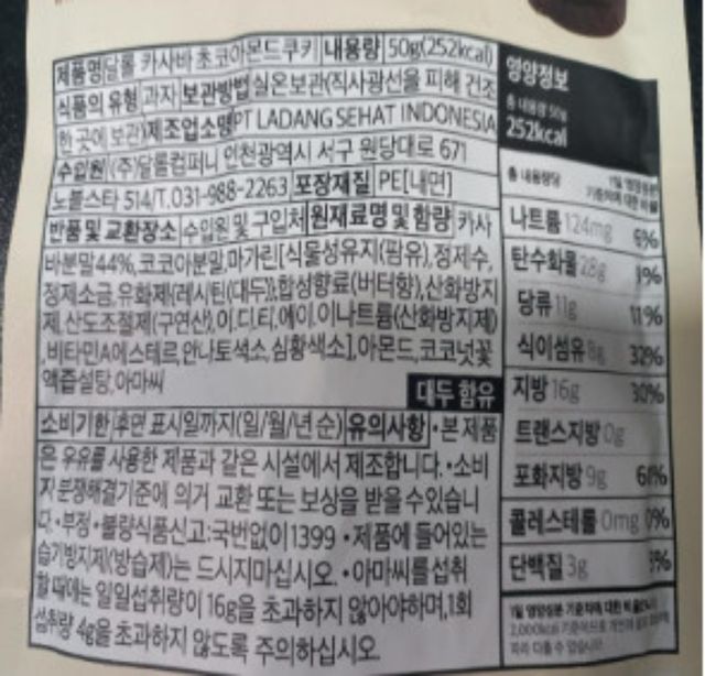 달롤 카사바 초코 아몬드 쿠키 영양성분표시. / 식약처 제공