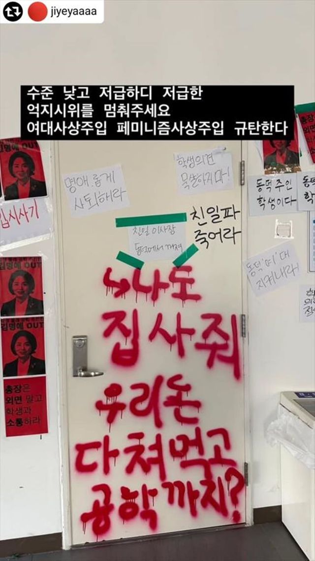 사진 속에는 빨간색 래커로 '나도 집 사줘. 우리 돈 다 처먹고 공학까지?'라는 문구가 학교 벽에 적혀 있다. 또 김명애 동덕여대 총장의 얼굴과 함께 '김명애 OUT'이라고 적힌 스티커가 여러 장 붙어 있다.